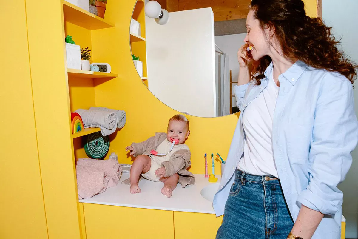 Quite often small children are unaware that their mummy and daddy also brush their teeth, as they tend to get up earlier and go to bed later. But when your baby sees that you also brush your teeth, they may want to do it, too.