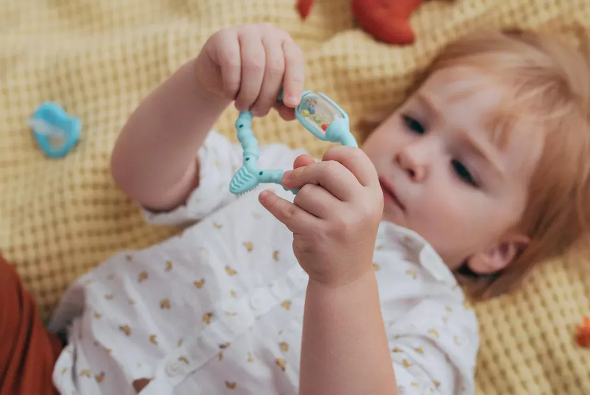 The arrival of a baby's first teeth is an exciting and memorable milestone for parents, but generally a painful and difficult process for babies. Chewing on a teething ring is a great way to counter the pressure and ease the pain of teething. Besides being free of harmful substances, our model also offers a lot of entertainment: An integrated rattle, colourful balls and a learning toothbrush that playfully prepares your baby for the day when they start brushing their teeth.