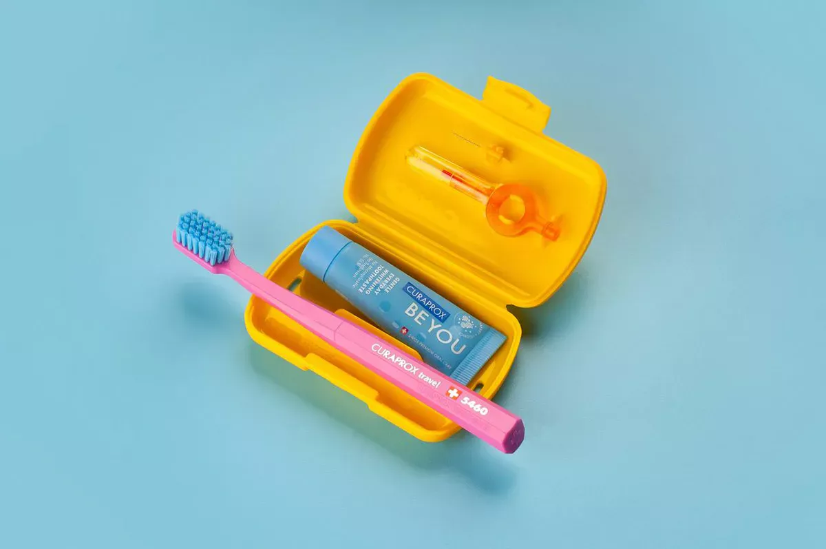 Even more practical than a bulky toothbrush case is a compact travel set containing a small tube of toothpaste and a travel toothbrush, which easily fits into a full suitcase, backpack or even a handbag. Curaprox offers stylish travel sets in a range of seven colours each with a different flavour of the 'Be you' toothpaste or the 'Black is white' whitening toothpaste .