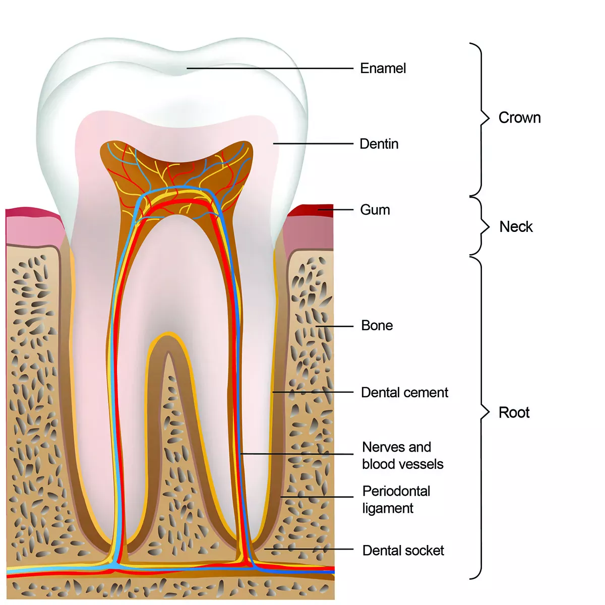 The hard enamel layer protects the soft dentin, which is permeated with nerves, from all kinds of discomfort. Only when the enamel is intact can we chew and eat without pain and enjoy a cool refreshment or a warming cup of tea. If the dentin were exposed, it would react with pain to temperature fluctuations, sweet and sour foods. It would also be defenceless against bacteria. Bacteria could eat their way undisturbed into the tooth interior and destroy our teeth.