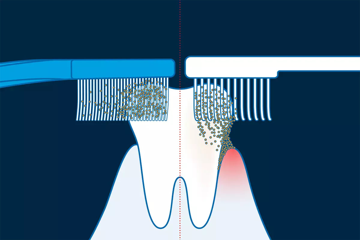 Most people think that they are doing their teeth a favour by using a hard toothbrush because it cleans particularly thoroughly. This is not true. A hard toothbrush is too stiff to adapt to the tooth structure and therefore cannot remove all the plaque. It also damages your gums and tooth enamel - especially if you press hard when brushing your teeth. The most thorough - and gentle - cleaning is achieved when you brush your teeth with a soft toothbrush, as the bristles can bend effortlessly and brush the entire tooth surface.