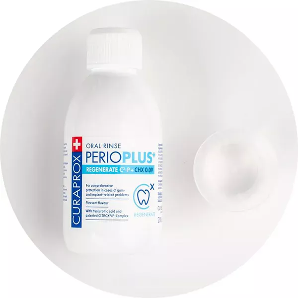 Curaprox Perio plus regenerate mouthwash and the accompanying Perio plus support toothpaste also contain hyaluronic acid.