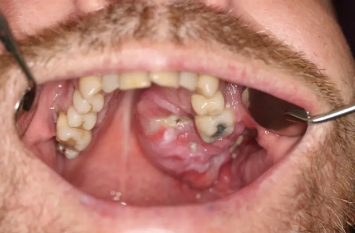 The majority of tumours developing within the jaw are benign and therefore do not fall under the category of "jaw cancer". Hence, we will not delve into further details about them here. Below, you will discover an overview of various malignant tumours impacting the jaw, accompanied by images illustrating what jaw cancer may look like. Please be aware that the images depict advanced-stage jaw cancer. During the early stages, jaw cancer may appear less prominent and might be mistaken for different dental or gum diseases. Find out how to recognise jaw cancer in the section on symptoms.