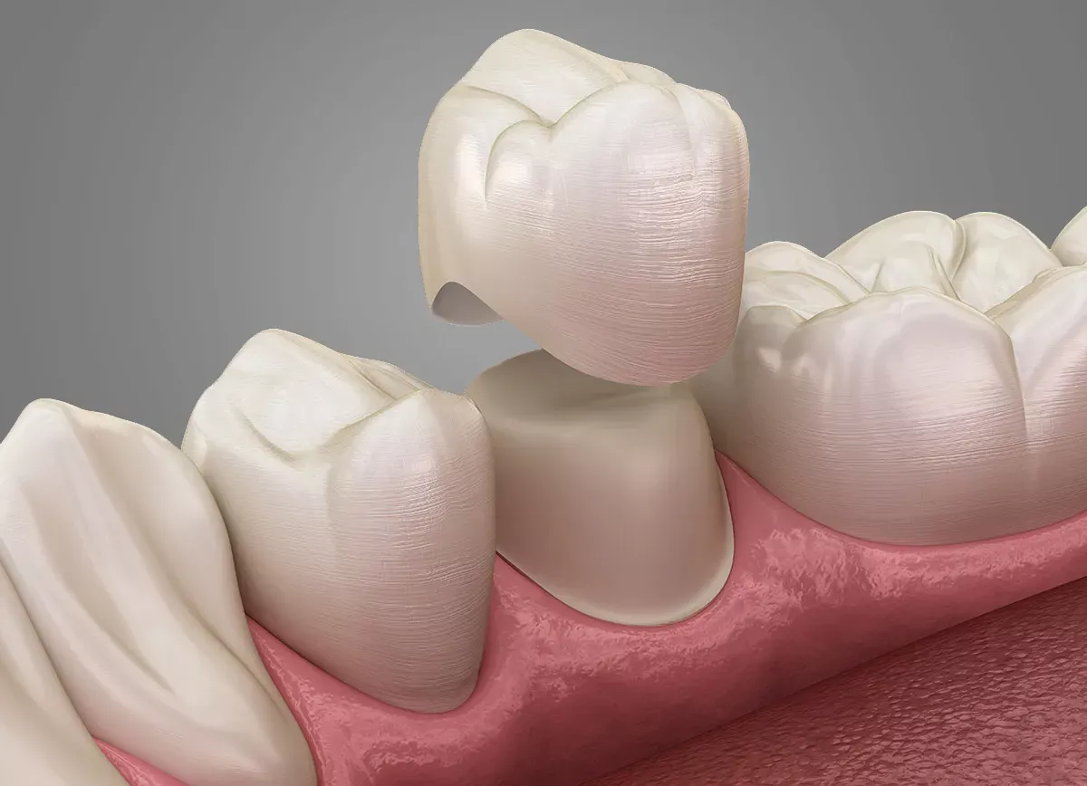 If the root of a tooth is intact but the crown is broken off or so badly affected by decay that fillings or inlays are no longer possible, the dentist can fit a crown. To do this, he or she grinds off the affected tooth. A dental technician makes the crown in the laboratory using an impression and then the dentist cements it onto the remaining tooth stump. The crown serves to protect the root of the tooth on the one hand, and on the other hand it ensures that the chewing and speaking functions as well as the appearance of a complete set of teeth are restored. Once it is bonded on, it cannot be removed.