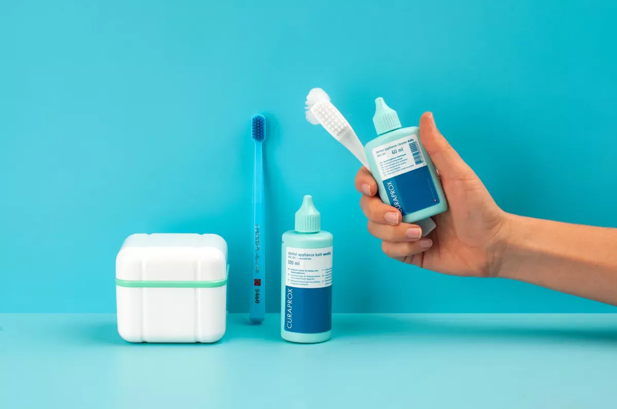 The Curaprox cleaning set contains everything you need to clean your removable dentures: daily cleaning gel, denture brush, weekly disinfectant, storage box and instructions - and as an extra, the CS 5460 super-soft toothbrush for massaging the gums.