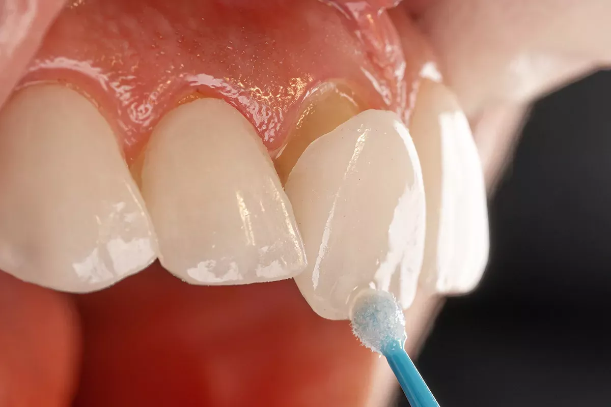 After the dentist has checked whether the veneers fit, he cleans the teeth and dries them. The enamel is etched with an acid so that the veneers hold better. If the dentin, i.e. the layer under the enamel, is exposed, it is treated with a special dentin adhesive to ensure that the veneer holds well. The dentist then bonds the veneer to the tooth with a special adhesive and hardens the adhesive with a blue light lamp. Bonding the veneers takes about 20 to 30 minutes per tooth.