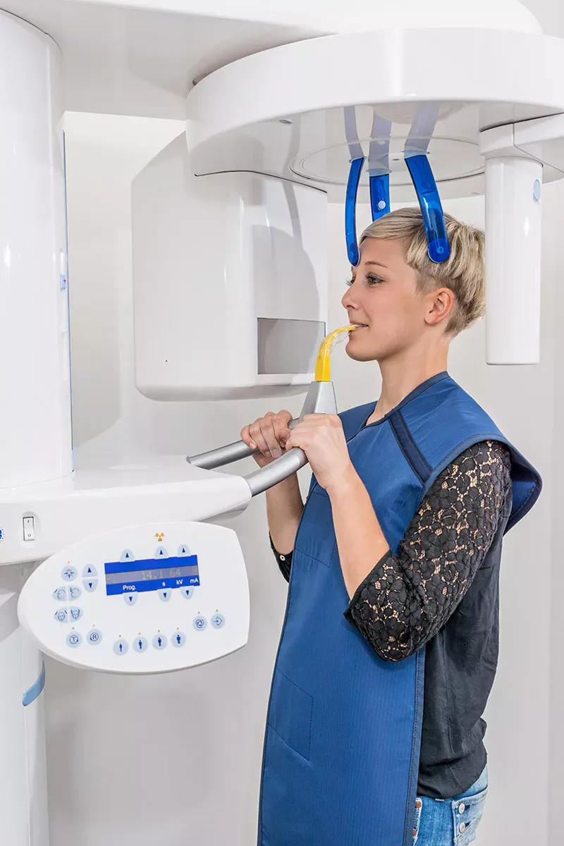Intraoral X-ray means that the patient has the imaging plate or X-ray film in their mouth and holds it in place by lightly biting down. This technique is mainly used when individual teeth need to be examined specifically, for example because there is a suspicion of inflammation of the tooth root or caries in the spaces between the teeth.