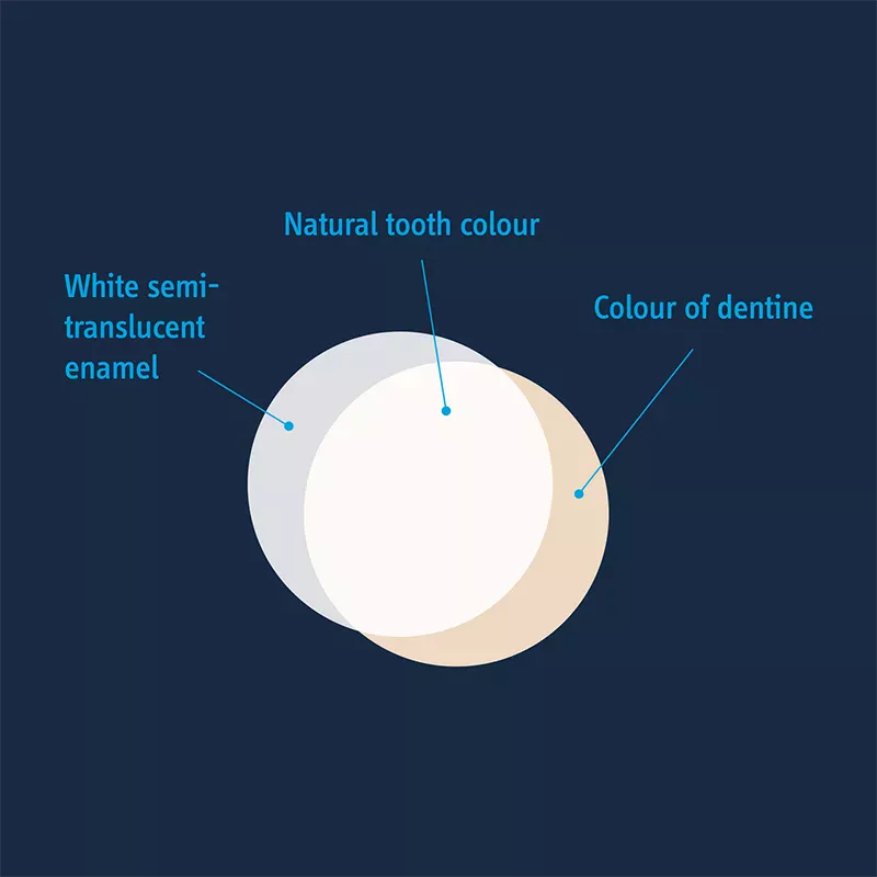 Tooth enamel is the hard, white substance that makes up the surface of the tooth. Underneath is the dentin, which varies in colour from person to person - from deep yellow to reddish brown. As the enamel becomes thinner, the natural colour of the dentin shines through more and more and the teeth look more yellow.